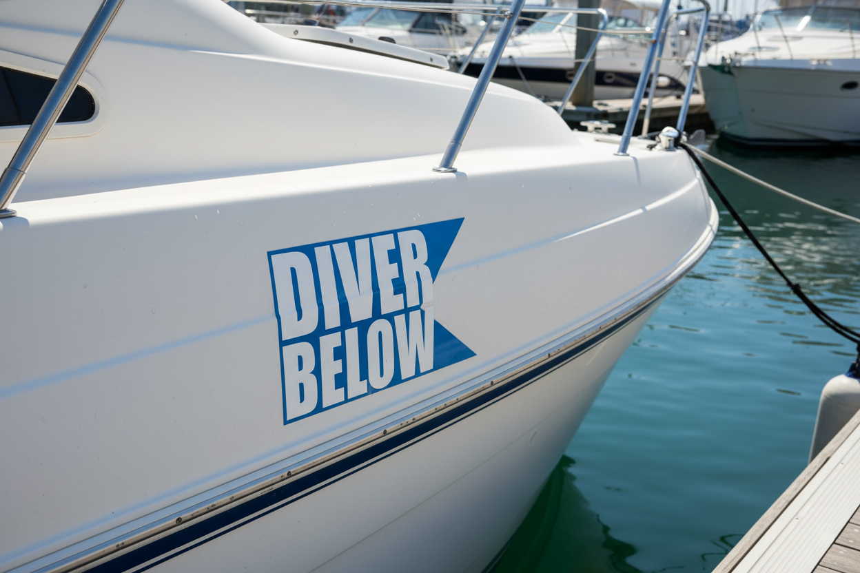 This Alpha Flag Diver Below vinyl sticker displays the internationally recognized dive flag symbol for diver safety. Made from durable 7-year outdoor vinyl, it's perfect for boats, cars, and dive equipment.