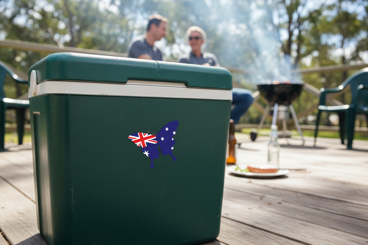 Show your Aussie pride with this unique butterfly sticker featuring the Australian flag design. Perfect for cars, boats, bikes, windows, doors, or any smooth surface.