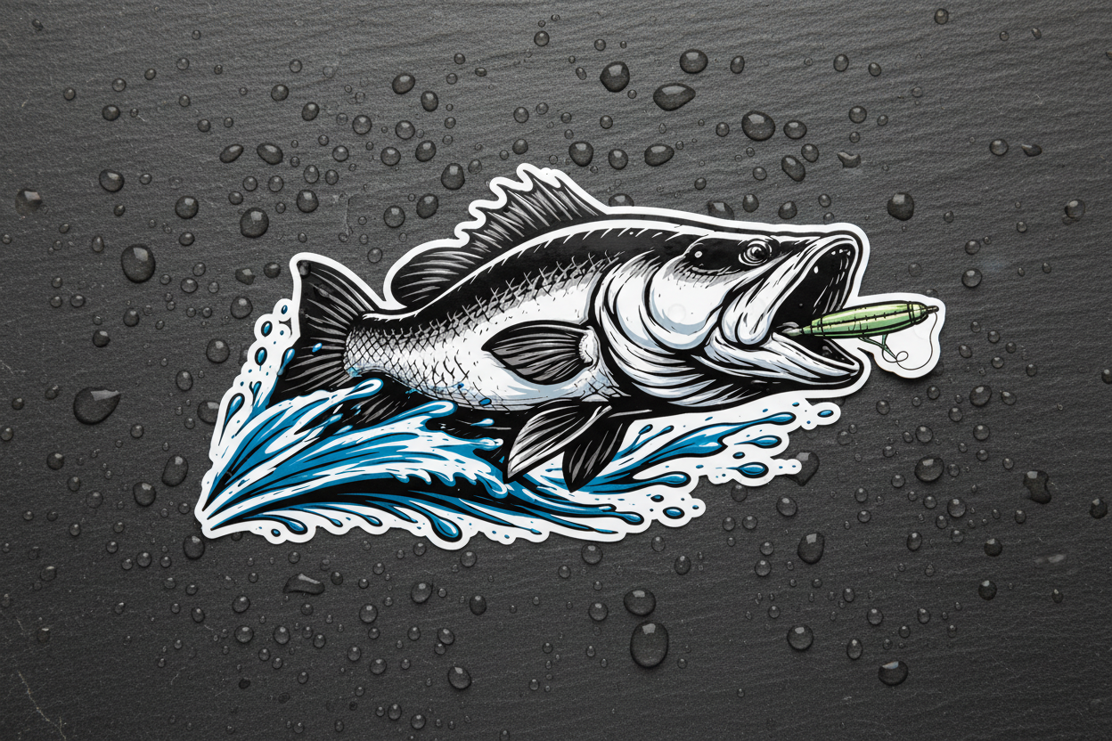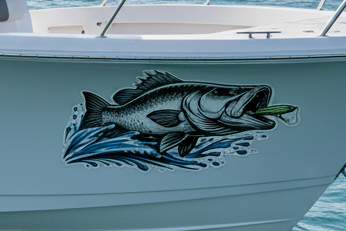 Featuring a barramundi mid-strike with water splash detail, this design is built to look right at home on boat sides, rear windows, and fishing gear.