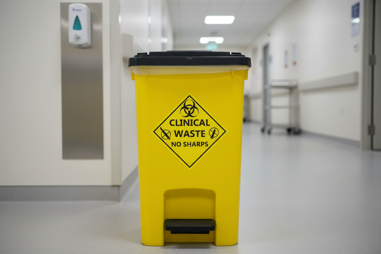 White container with a yellow 'Clinical Waste No Sharps' sign on a gray background