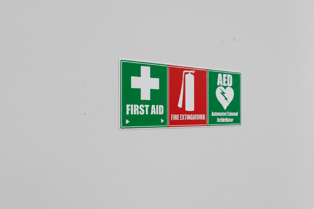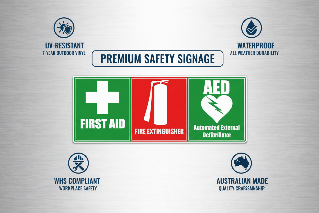 Stick-Dat produces commercial-grade safety signage in Brisbane, Australia. Our combined emergency signs consolidate critical safety information into a single, compliant visual – reducing clutter and improving emergency response clarity.