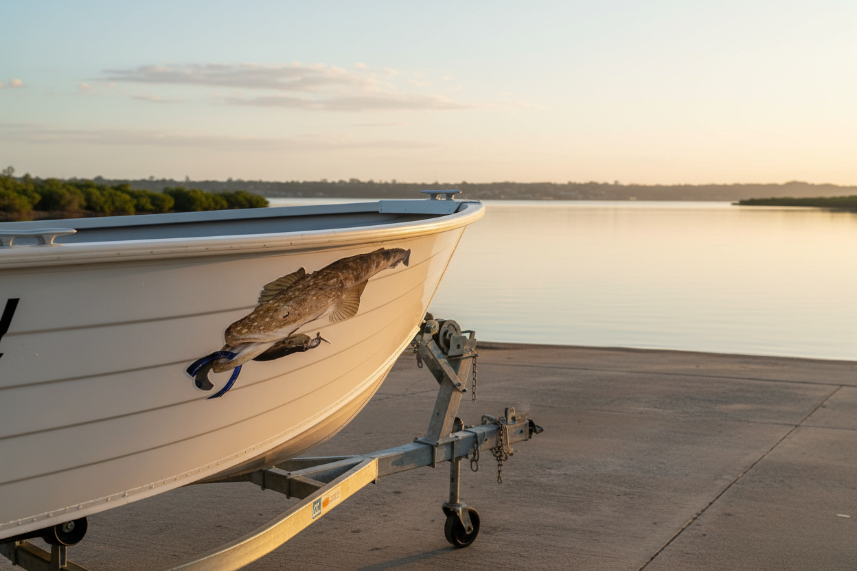 The Mirrored Pair gives you two stickers: one facing left, one facing right. Designed for symmetrical placement on both sides of a boat hull, vehicle doors, or a windscreen — so your flathead always faces forward on both sides. The go-to choice for boat builds and 4WD setups.