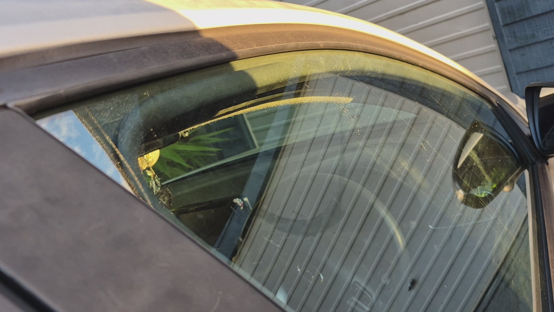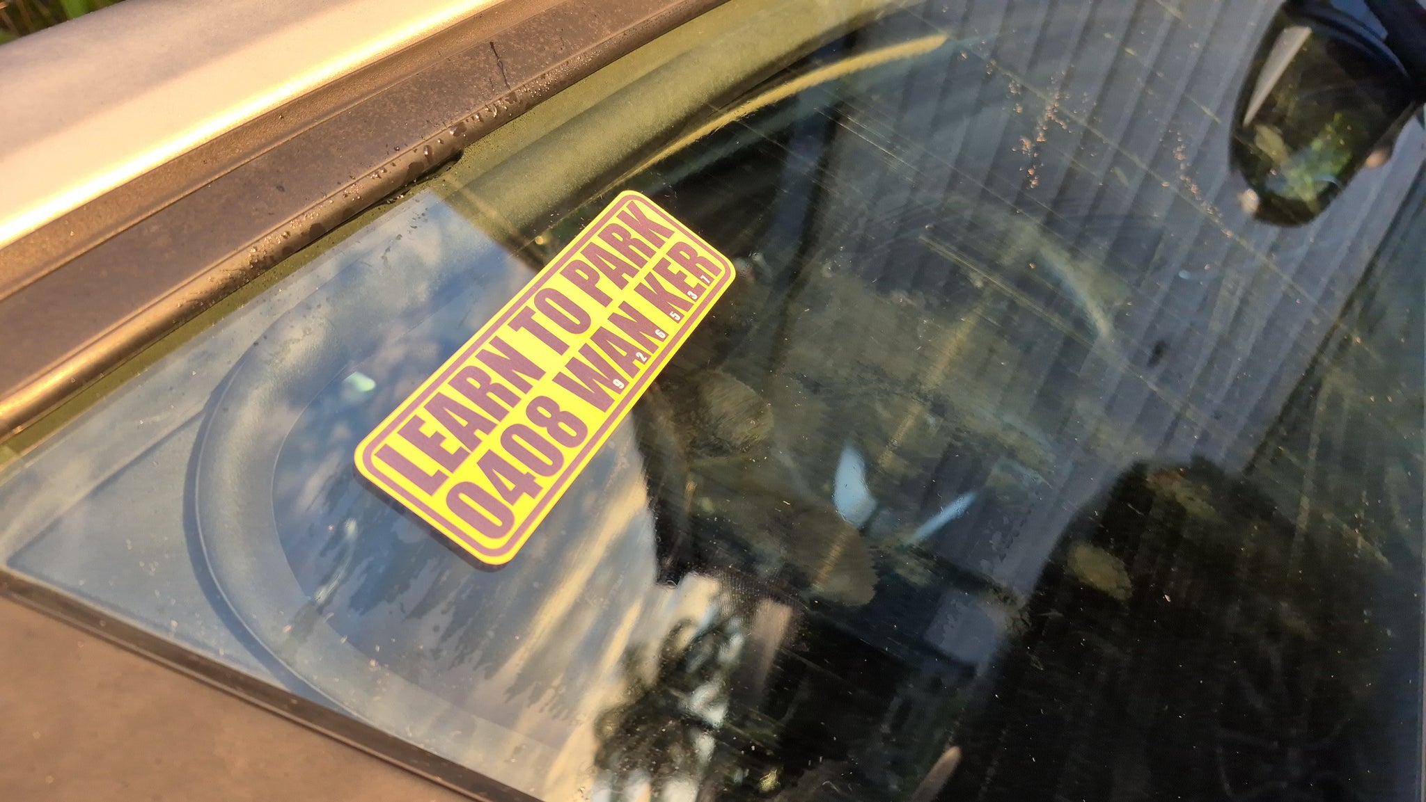 Yellow and purple 'LEARN TO PARK 0408 WAN KER' sticker on a car window.