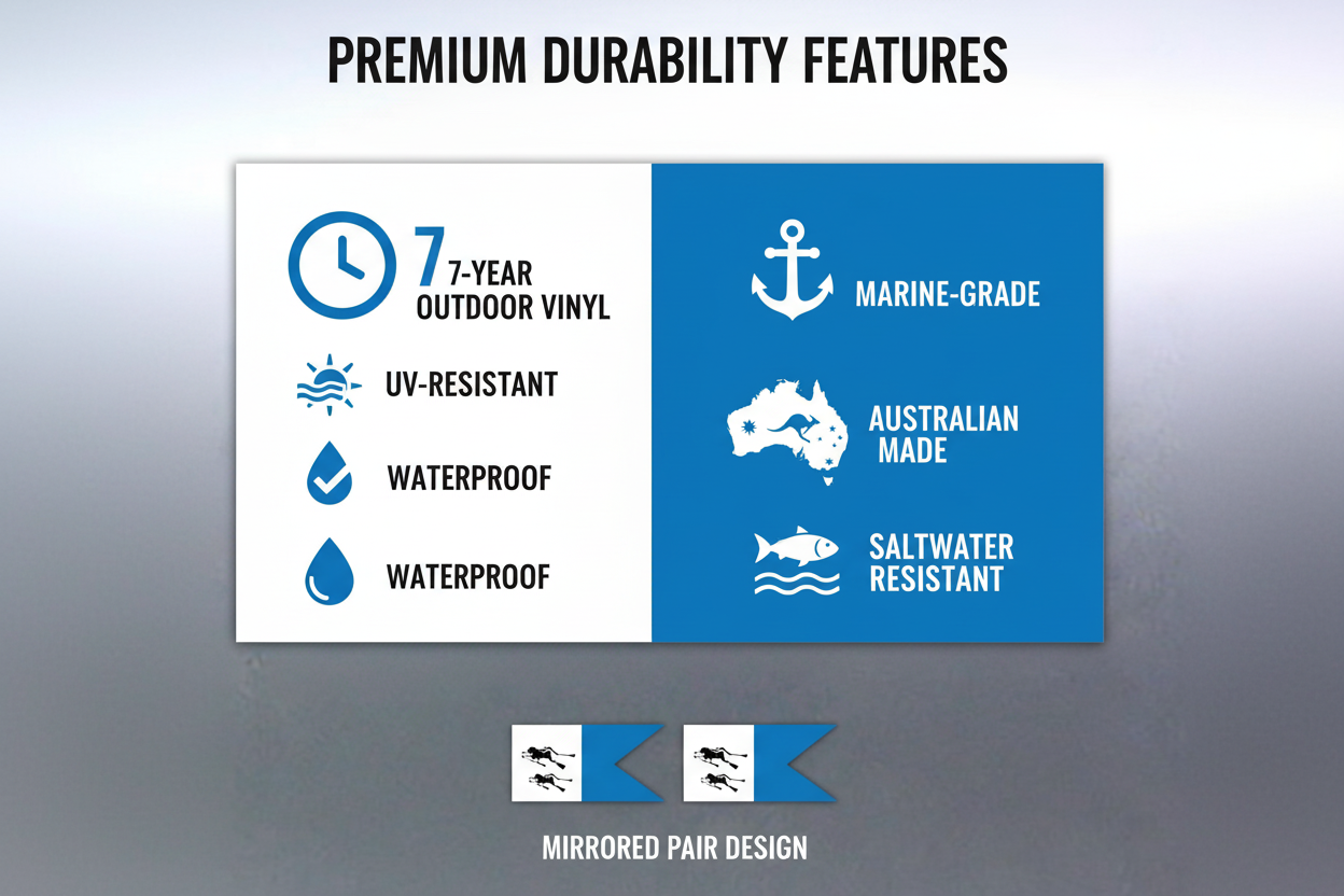 Made in Brisbane, Australia using premium 7-year outdoor vinyl and professional marine-grade printing. Built to withstand harsh Australian coastal and marine conditions.