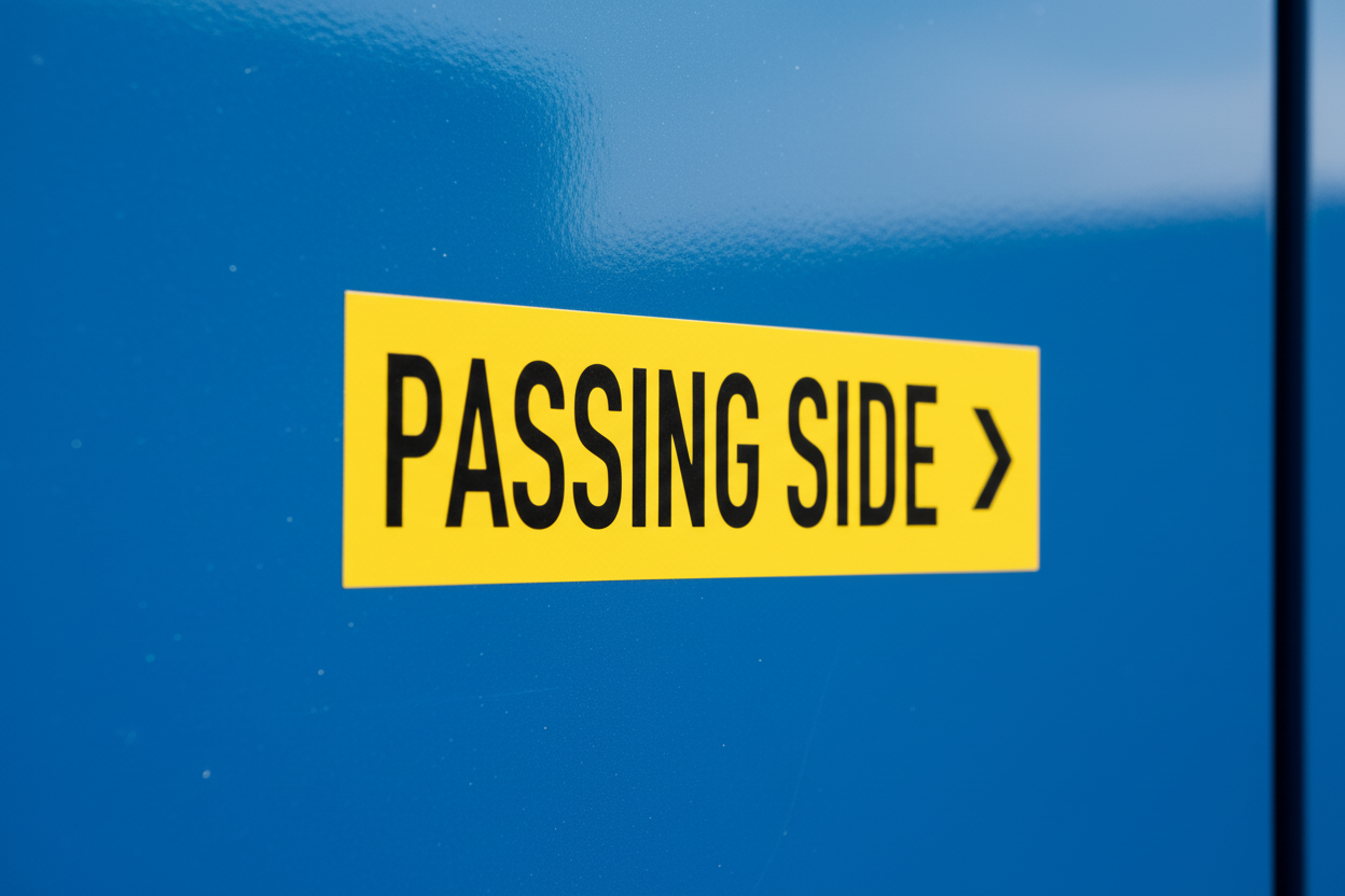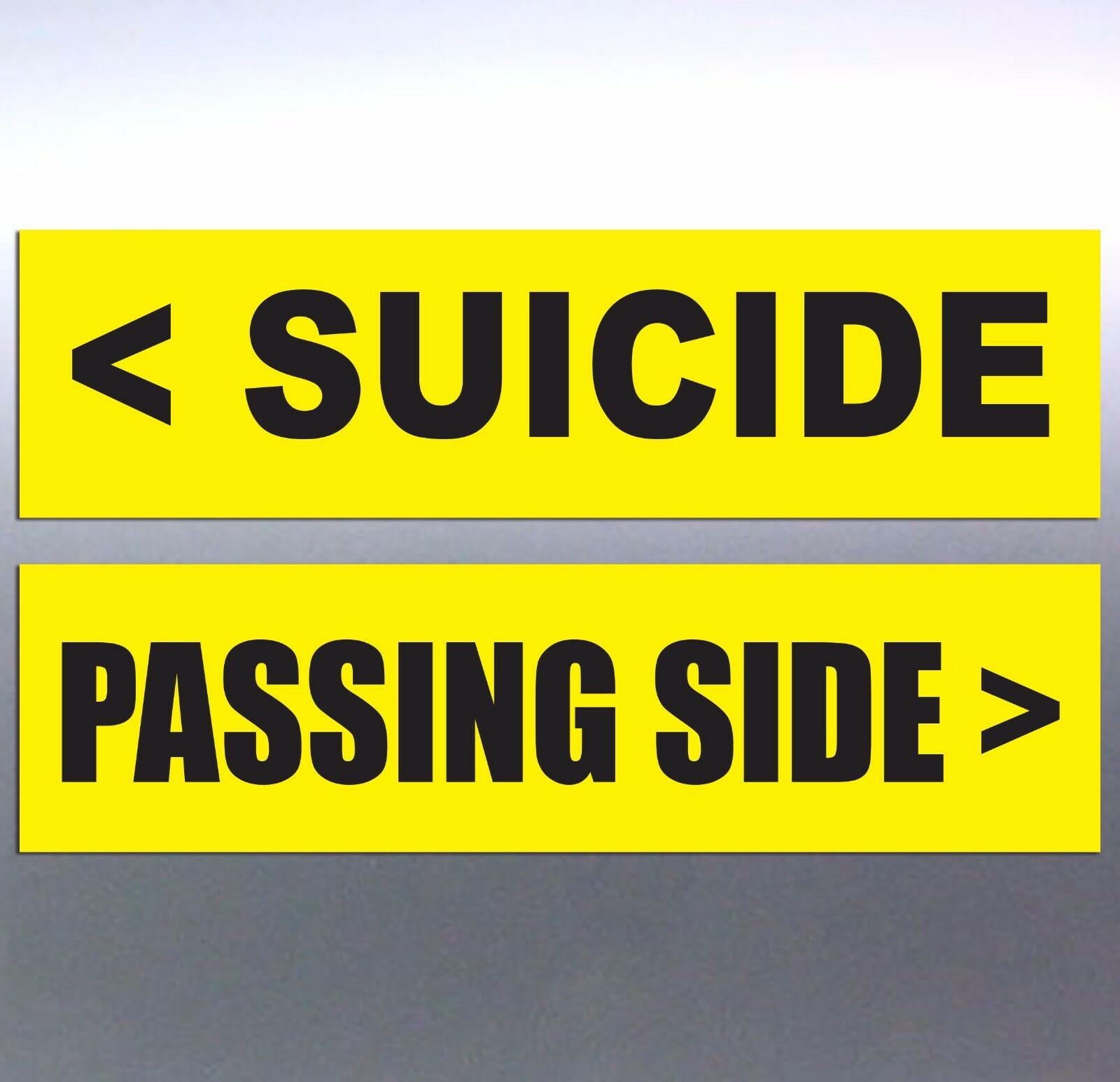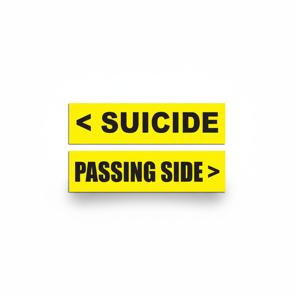 - Position correctly – Apply "Passing Side" to the right/driver's side and "SUICIDE" to the left/passenger side of your vehicle.
