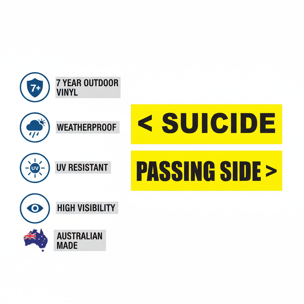 On large trucks and trailers, passing on the wrong side (typically the left/passenger side) can be extremely dangerous due to blind spots and limited visibility. The "SUICIDE" warning clearly indicates the dangerous side, while "Passing Side" shows the safer option. This simple safety measure can prevent serious accidents and save lives on Australian roads.