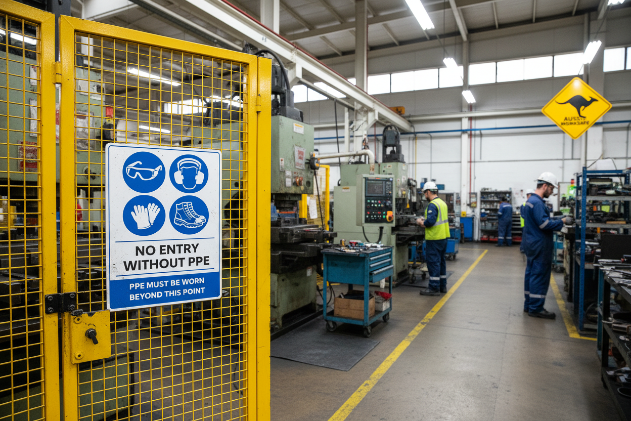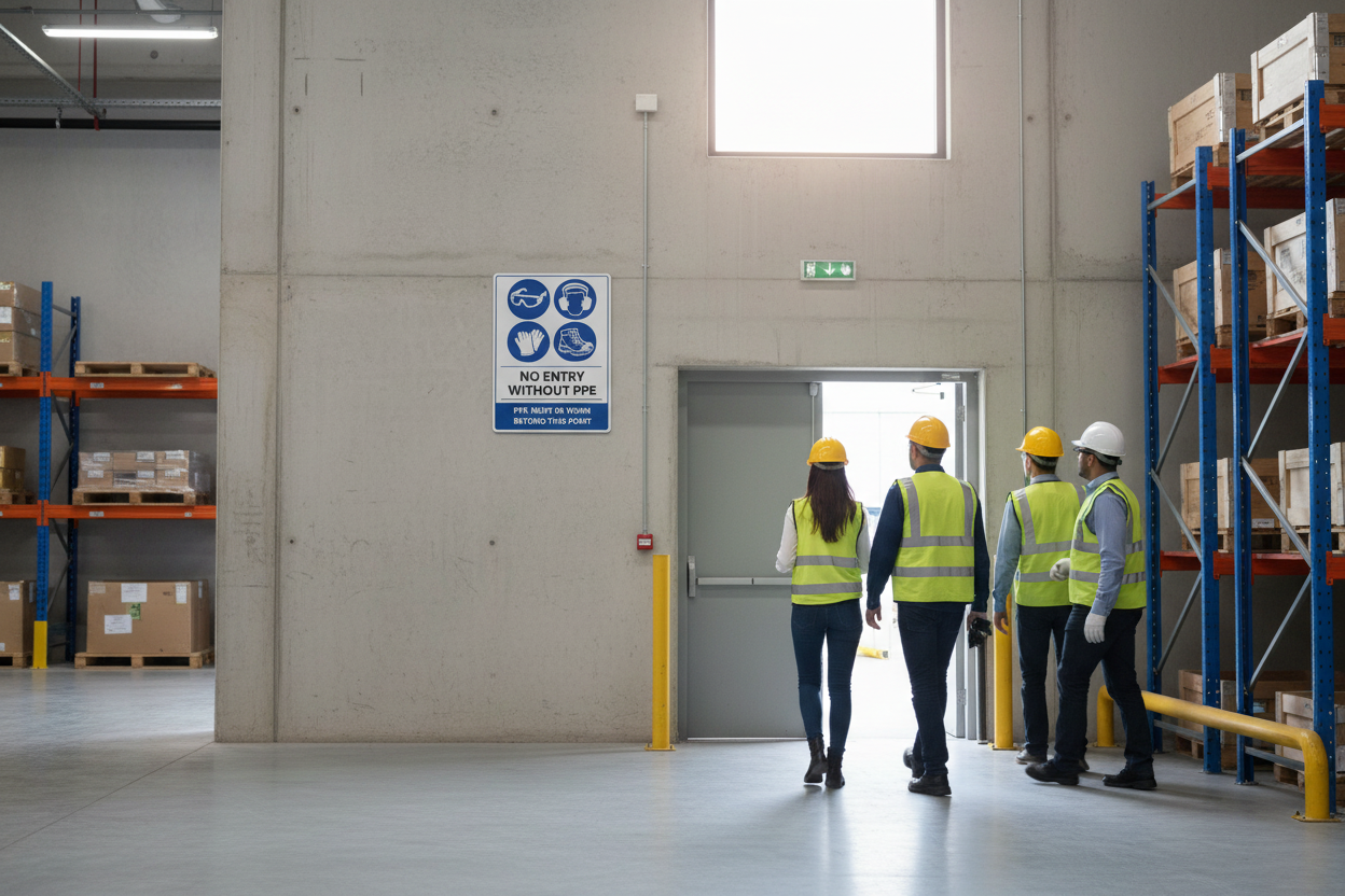 Designed for workshops, construction sites, warehouses and industrial environments where multiple PPE items are required before entry.