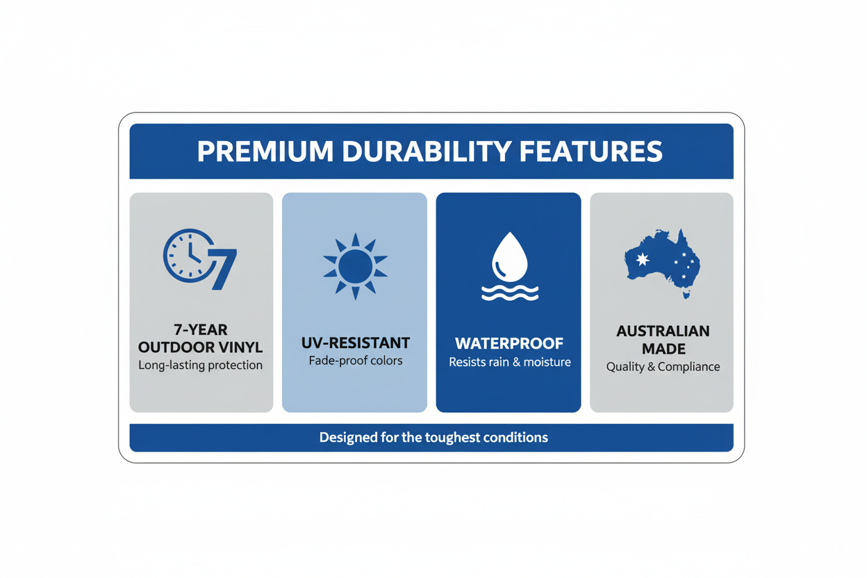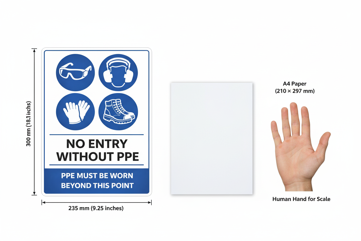 Using four ISO-style blue mandatory circles, this sign instantly communicates required PPE before entry — reducing risk and reinforcing site safety requirements.