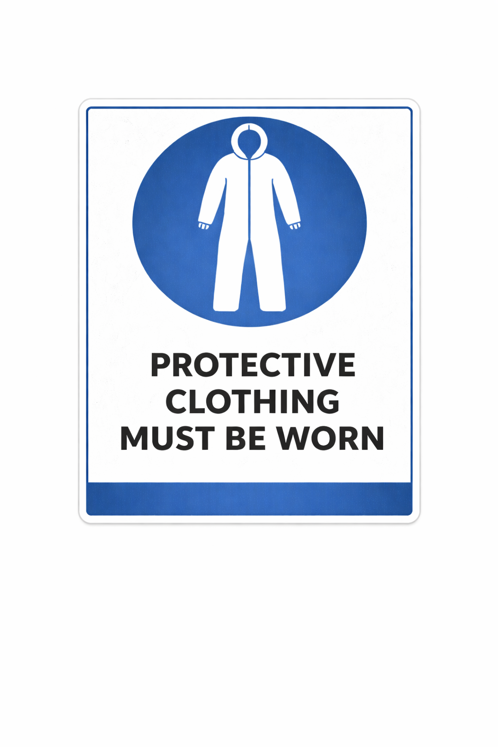 Clearly identify areas requiring protective clothing with this Protective Clothing Must Be Worn mandatory safety sticker. Designed for workshops, chemical processing areas, washdown zones and industrial workplaces, this sign reinforces compliance where coveralls or protective garments are required.