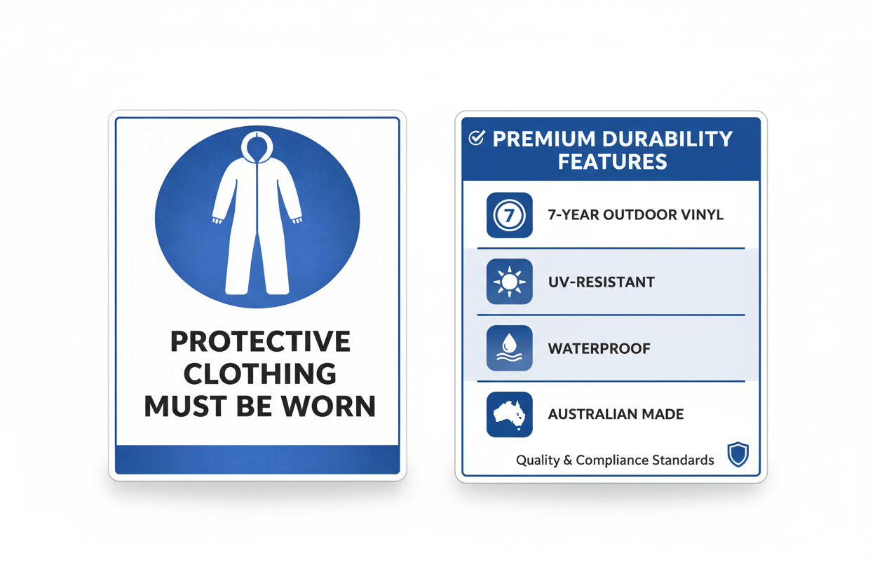 This sign is also commonly searched as "Protective Clothing Required sign", "Coveralls Must Be Worn sign", "Mandatory Protective Garments sign" or "PPE Clothing Required sign" for Australian workplaces.